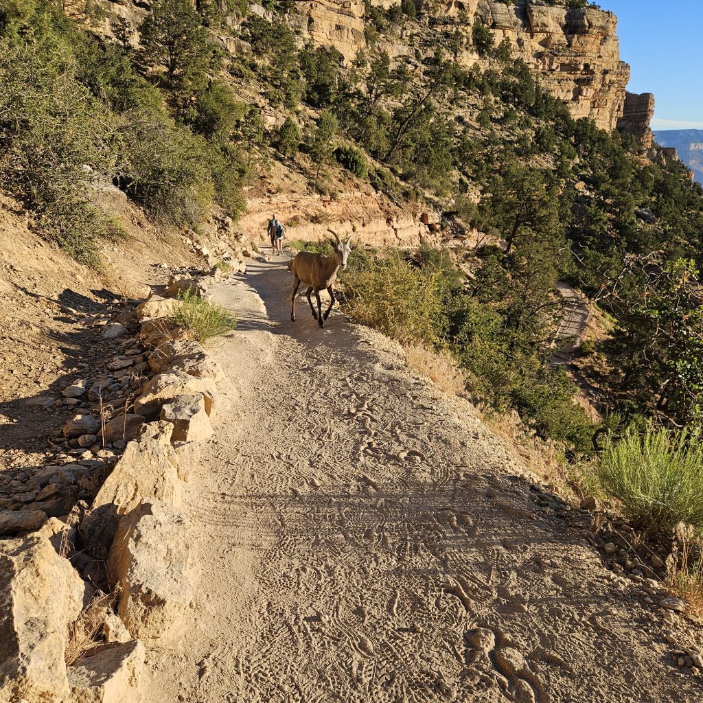 Le réveil à 5h fut douloureux car c’est 4h plus tôt que d’habitude mais nécessaire. On prévoit de faire le « Bright Angel Trail » 😇, qui fait un aller retour au fond du Canyon pour aller voir un point de vue sur la Colorado River. Sur le papier c’est 950m de dénivelé positif pour ~10 km mais le problème c’est encore une fois la chaleur qui va atteindre les 43°C 🥵. Le temps de déjeuner, se préparer et de se parquer, on commence la balade à 6h. On croise sur le chemin un petit bouquetin 🐐 qui doit se demander ce qu’on fait là aussi tôt.